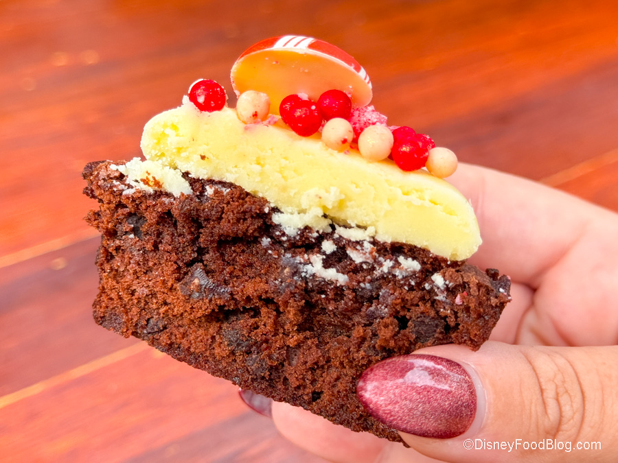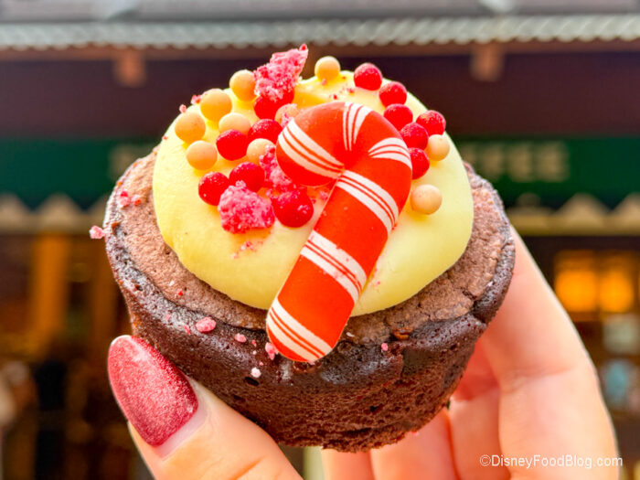 We’re starting at Creature Comforts, aka the Starbucks location in Animal Kingdom. Here, you can get a Peppermint Ganache Brownie for $5.79, which is a fudge brownie topped with peppermint-white chocolate ganache and peppermint pieces. This is a super cute treat.