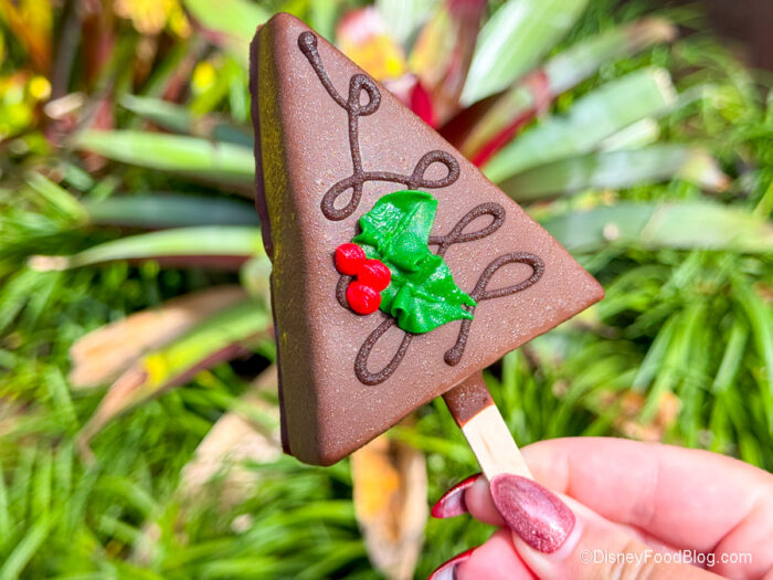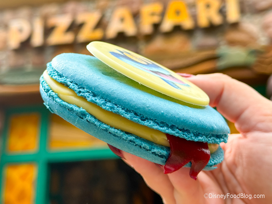 Okay, so technically, the next snack we tried isn’t a holiday treat PER SE, but it’s a Zootopia 2-themed treat. The Gary De’Snake Macaron at Pizzafari is a passion fruit ganache-filled macaron with raspberry jelly décor and chocolate décor for $6.49. The macaron is HUGE, plus it’s charming with the Gary design on the white chocolate medallion. And the little tongue sticking out of the macaron is ADORABLE.
