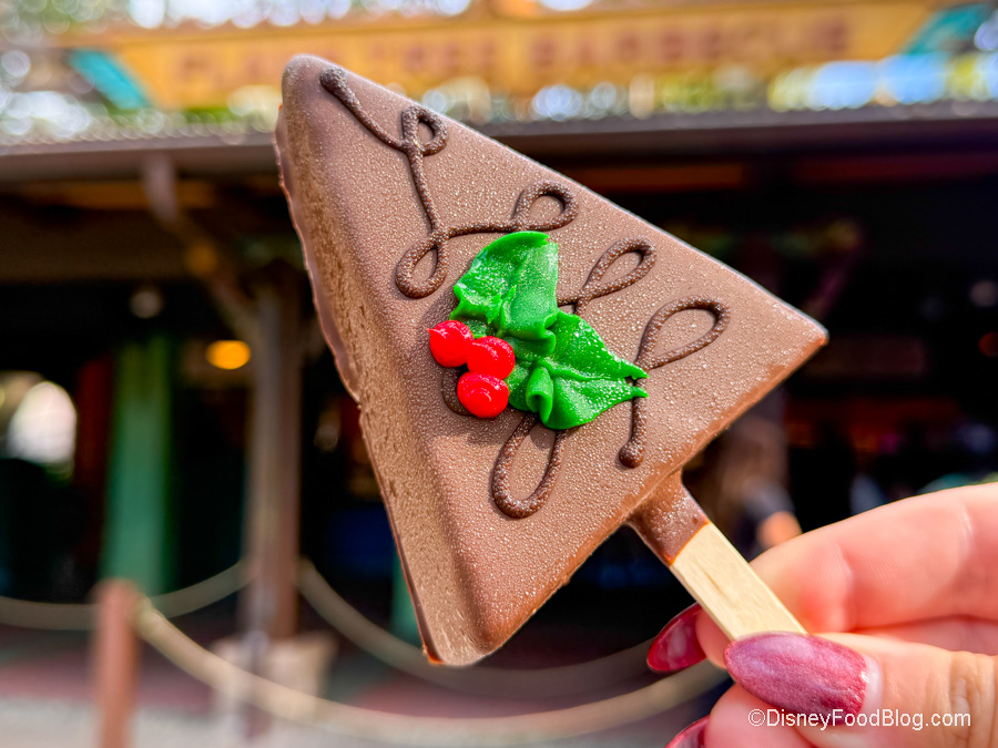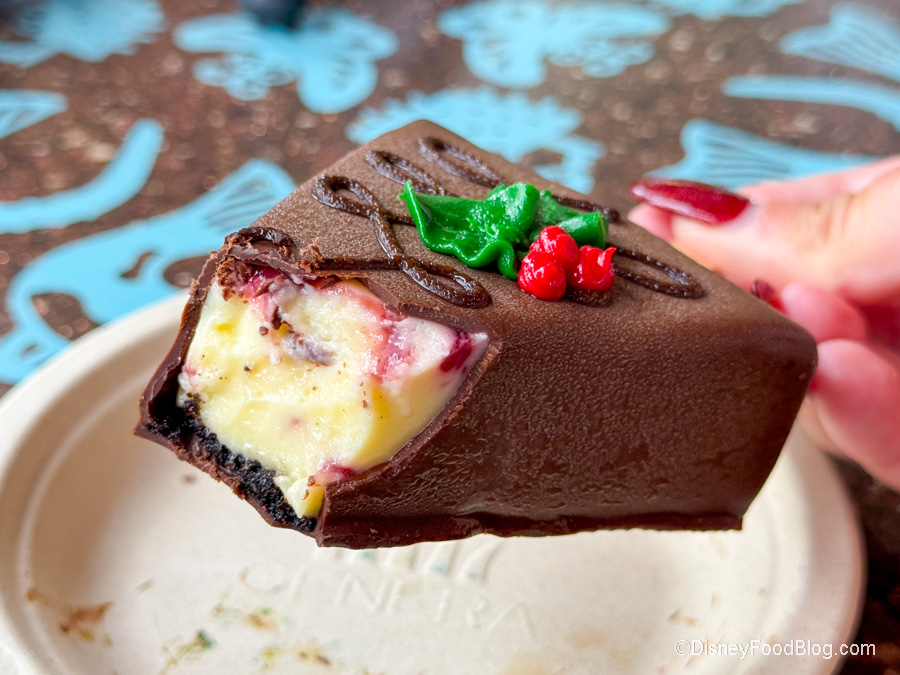 Next up, we grabbed the Cranberry-Cherry Cheesecake Pop at Flame Tree Barbecue. This is white chocolate cheesecake with cranberry-cherry swirl dipped in dark chocolate with cookie crust for $6.29. This is another cute snack with a fun design that even includes a hidden Mickey.
