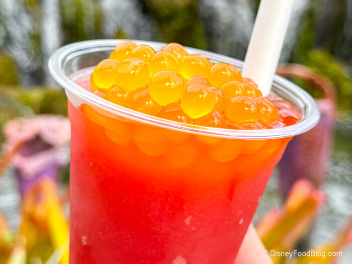 So we’ve got another movie promotional treat coming your way. It’s the Nightwraith Blaze, a drink themed around Avatar: Fire and Ash. It’s available at Pongu Pongu for $10.29, and it’s a blood orange, lychee, and wildberry slushy topped with a glow cube and passion fruit juice-filled pearls. Nightwraiths are a new kind of flying creature introduced in the movie, so this drink is dedicated to them. We’re just going to tell you now…this is even better than the standard drink here, the Night Blossom.