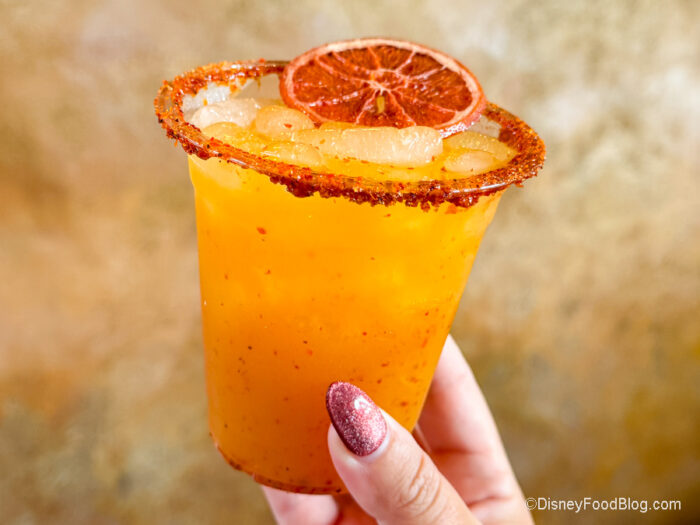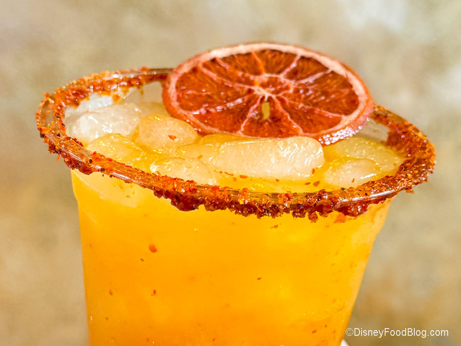 Okay, we’ve got another new drink that’s celebrating the release of Avatar: Fire and Ash. The Trader’s Tailwind at Satu’li Canteen is made with Captain Morgan Original Spiced Rum, Bols Triple Sec Liqueur, Mango Purée, Minute Maid Orange Juice, Chamoy, and Ginger Beer with a Chili-Lime-rimmed Glass garnished with a Dehydrated Blood Orange Wheel for $16.50. Yep, there is a LOT going on with this drink.