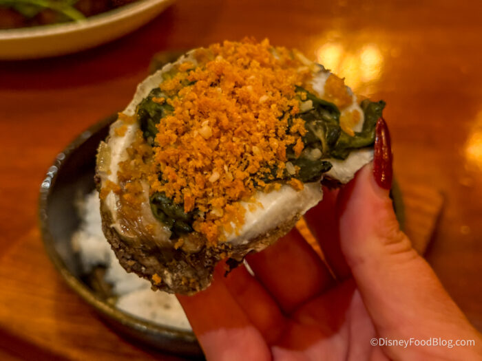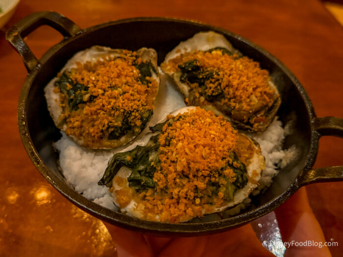We also tried the new Oysters Rockefeller for $22, and while these have the classic texture and that fresh, briny flavor of oysters, we do feel these were bland when it came to flavor. We got a bit of the herby notes, and the spinach was more of a cooked collard greens texture, and there was a bit of crunch from the breadcrumbs, but the flavor was lacking for us.