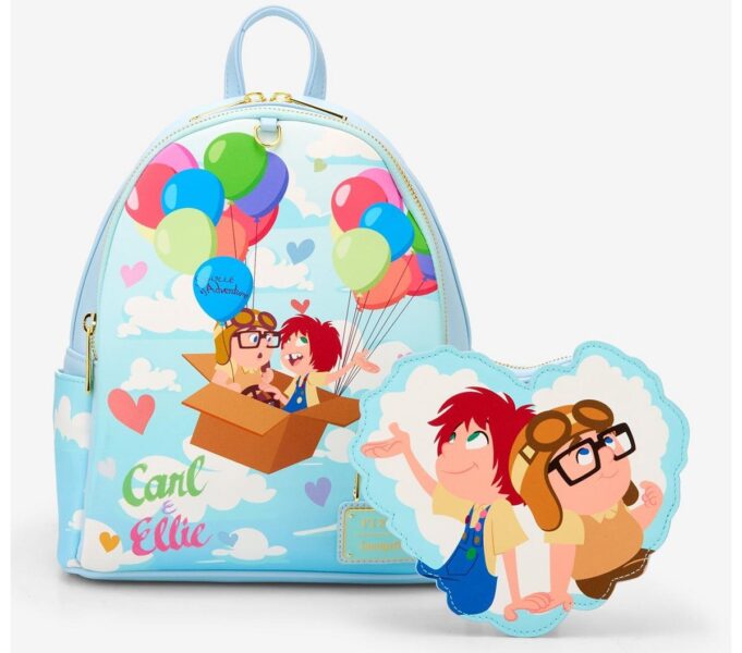 Adventure is out there with this Up backpack that features a young Carl and Ellie floating above the clouds in a cardboard box attached to balloons. Inside is a pattern featuring the iconic couple. This bag also has a matching coin purse.