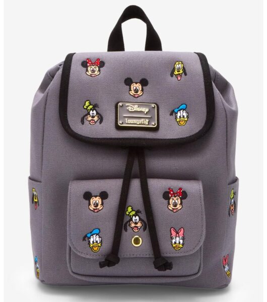 This canvas backpack has an adorable embroidered pattern of Mickey, Minnie, Goofy, Daisy, and Donald on it. They’re even on the inside lining, too. The bag secures with a magnetic flap and a drawstring.