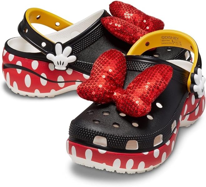 Know someone in your life who adores Crocs? They’ll absolutely love the Disney Minnie Mouse Classic Crocs! These are patterned to match Minnie’s outfit perfectly, all the way down to the bottom of the shoes being red with white polka dots like her dress, and a sequined red bow on top.
