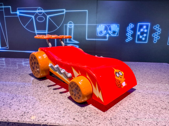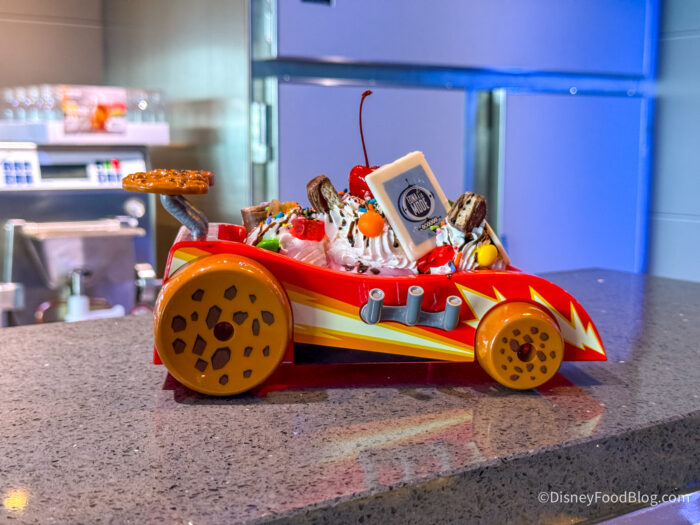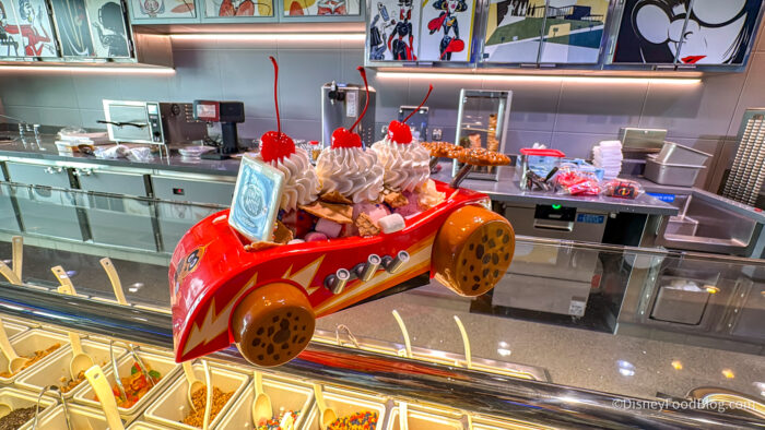 The Signature Sundae here is only $12.75 (which is a GREAT deal), and it comes in a plastic Incredibles-themed car with wheels made to look like cookies. We do feel the car is pretty good quality, and since the wheels do turn, you can “drive” the car, if you’d like, and the sundae consists of 3 scoops of ice cream or gelato, 5 toppings, whipped cream, and cherries.