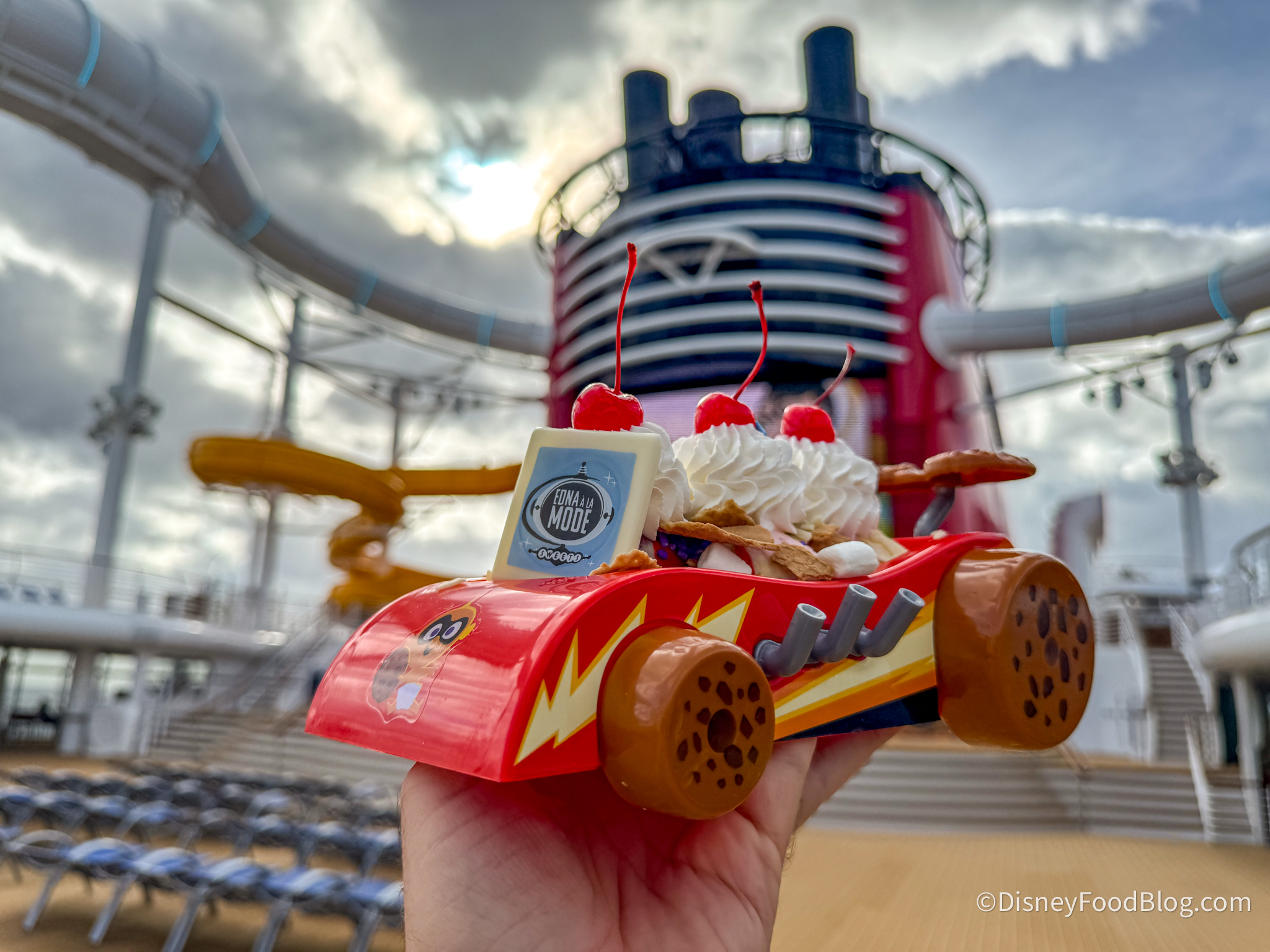 On the Disney Destiny, that shop is Edna Á La Mode Sweets, which is themed to The Incredibles (more specifically, Edna’s lab with Jack-Jack trying to grab his cookie!), and has TONS of sweets to check out. The Signature Sundae here is cute as can be, but is it really worth the price? We tried it out so you can know before you get on board!