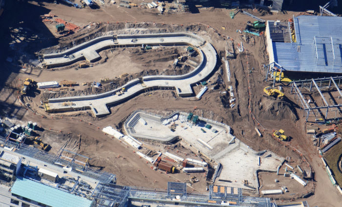 From another view of the construction, we can also see what looks like a zero-entry section of the pool area, which we have a feeling will be big with families. It looks like the lazy river needs a few more pieces to be fully complete (if it’s going to go in a full loop, that is), but the base of the pool appears to be pretty complete.