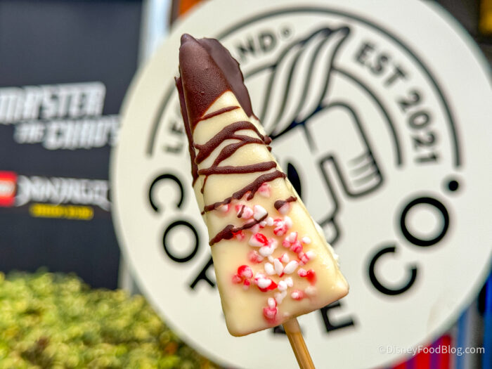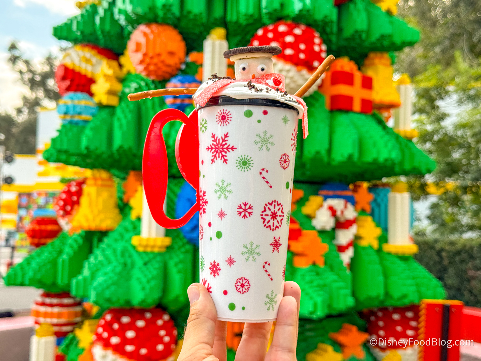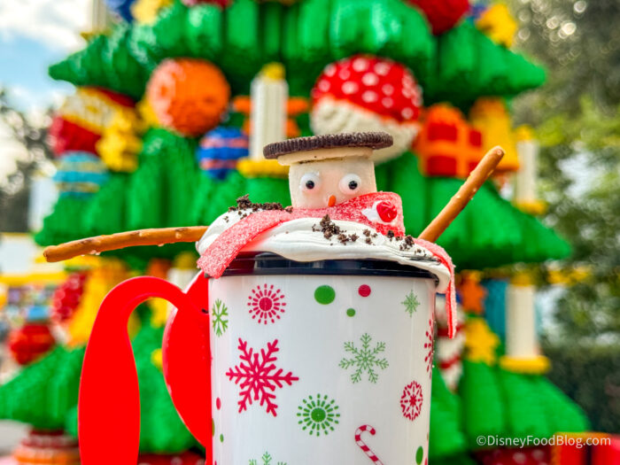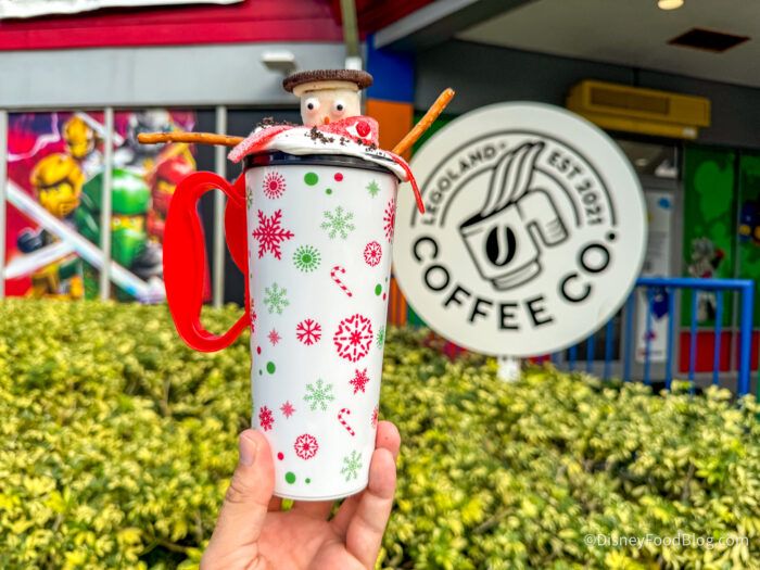 Then it was time for some special treats, so we stopped by Legoland Coffee Co. for two of their holiday offerings. To drink, we tried the Let It Snow-Coa for $15.29, which comes in a reusable cup!