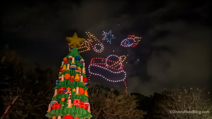 Finally, it was time for the tree lighting, which is also where Legoland revealed that the opening date of their new ride, Galacticoaster, will be February 27th, 2026! They didn’t just say it, though — they brought out some new friends from the ride, and announced the date with a drone show.