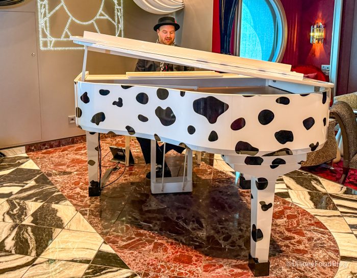 In the center of the room, you’ll find a live performer playing lots of Disney tunes and other classics. The piano is modeled after those classic spots that Cruella loves so much. Eagle-eyed fans will notice a few hidden Mickey’s in the design as well.