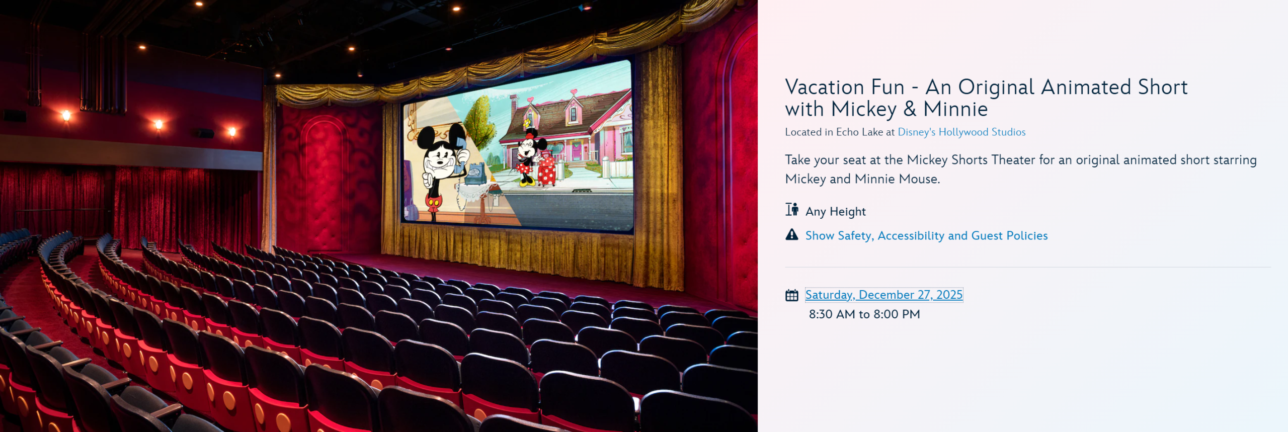 The full name of this attraction is Vacation Fun – An Original Animated Short with Mickey & Minnie, and it’s exactly what it sounds like — it’s a short film that celebrates Mickey and Minnie’s favorite vacation memories! You’ll see completely new animation mixed with clips from favorites like Panda-monium, Couples Sweaters, Potatoland, Croissant de Triomphe, Entombed, Dumb Luck, Al Rojo Vivo, Yodelburg, and Outback at Ya!.