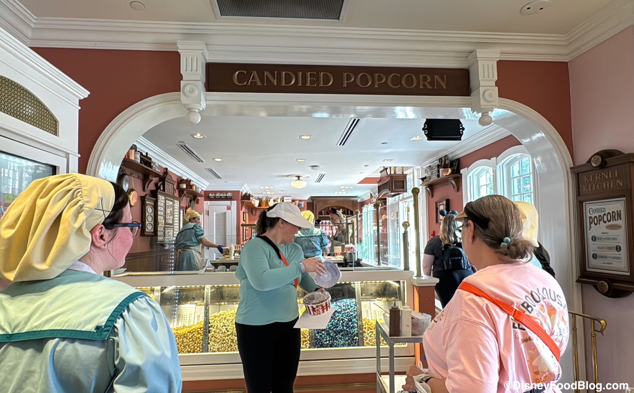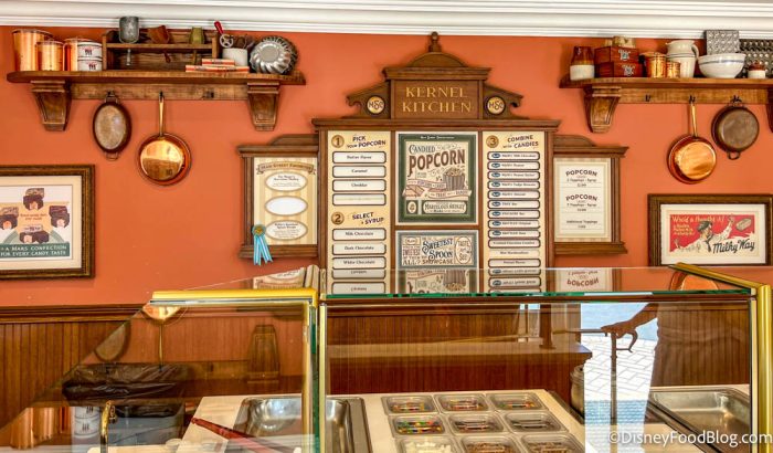 A Cast Member told us that at least one guest a day is picked at random to be the “Chef of the Day.” They’re invited to create a mix of their choice on a rolling counter that is brought out in front of the popcorns on display. And, as the chef, the Cast Member said they can choose as many flavors of popcorn as many toppings and drizzles as they want.