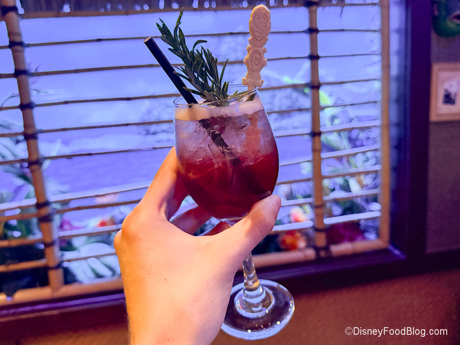 The cinnamon syrup in the drink tastes artificial, so we had to try to get past that. It was strong in some sips and then non-existent in others, too. But the rum and fruit juices certainly made it feel festive. We didn’t get a lot of the sparkline wine, but it did add a nice bubbly effect on our tongue.