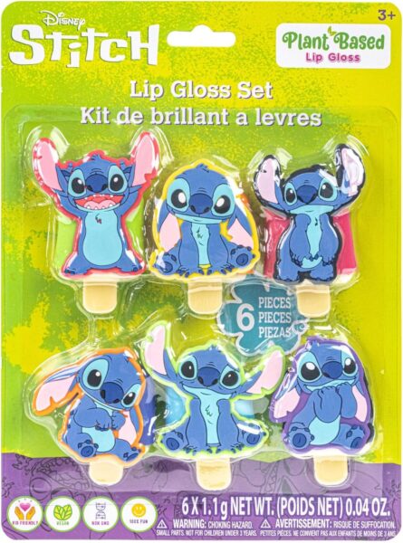 This set includes 6 plant-based pucker pop lip glosses in the sweet scents of watermelon, bubble gum, strawberry, berry, and blueberry. Each gloss pot is shaped like a popsicle, each decorated in different, adorable poses of Stitch. Non-toxic, plant-based ingredients are what make these lip glosses safe and easy to use for children ages 3 and older, including tweens and teens.