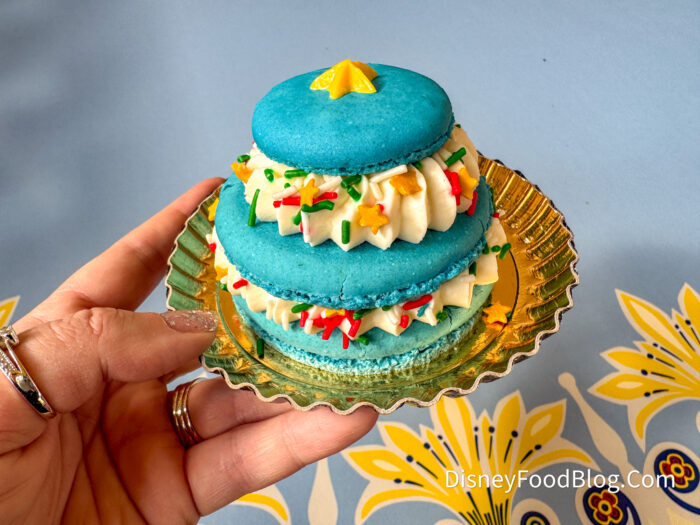This Mary Poppins-inspired quick service can see long waits, so we prefer mobile order here, and that’s exactly what we did to try out the new Milk and Cookies Tree-shaped Macaron for $8.29.
