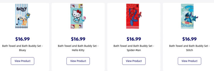 We love these Bath Towel and Bath Buddy sets that come with a towel and a plush. Grab Bluey, Hello Kitty, Spider-Man, or Stitch versions for $16.99!