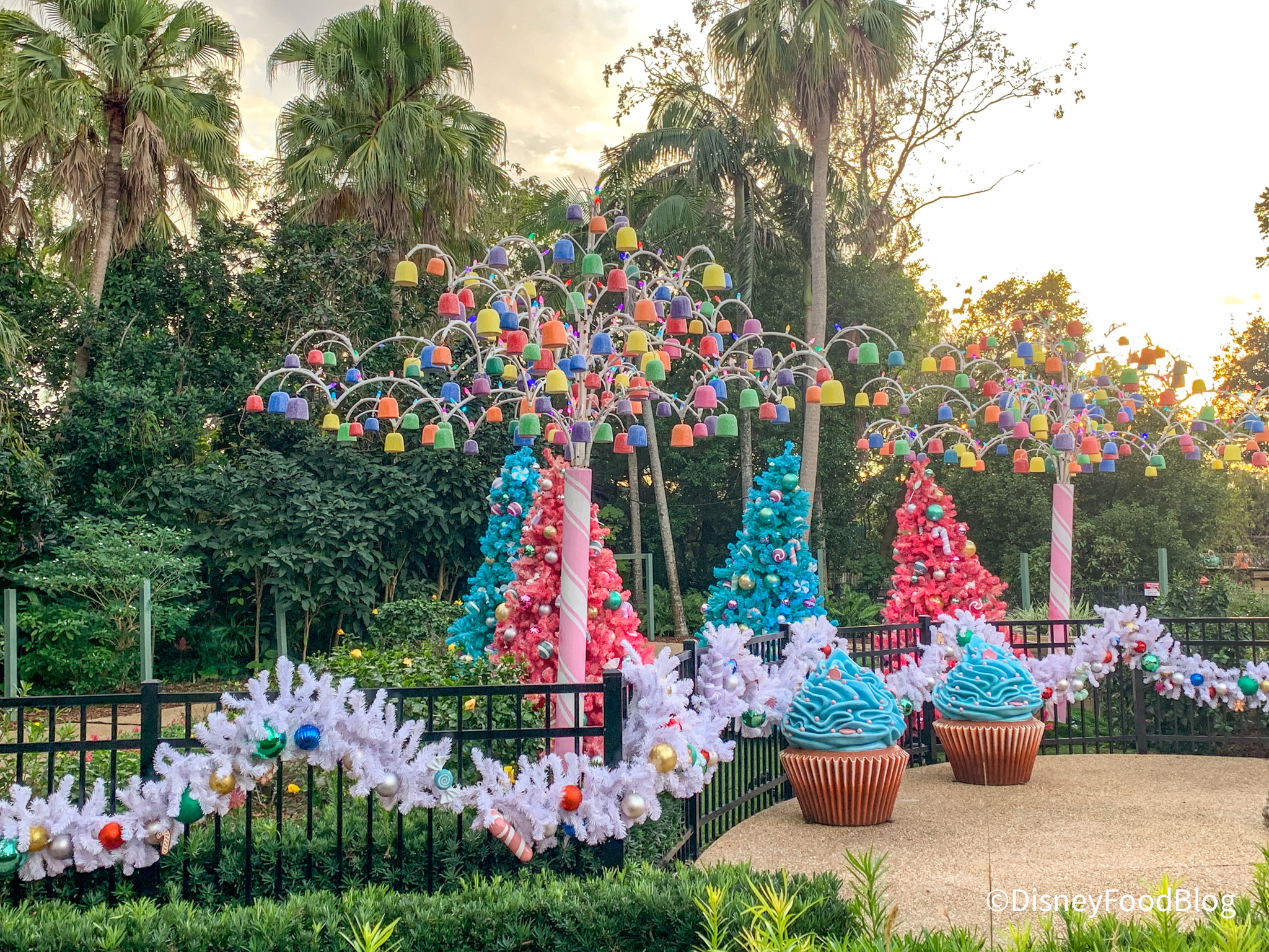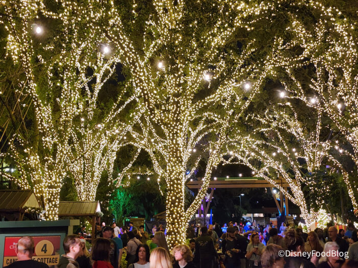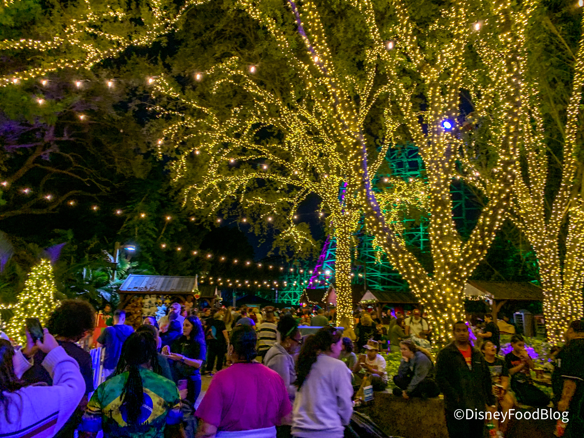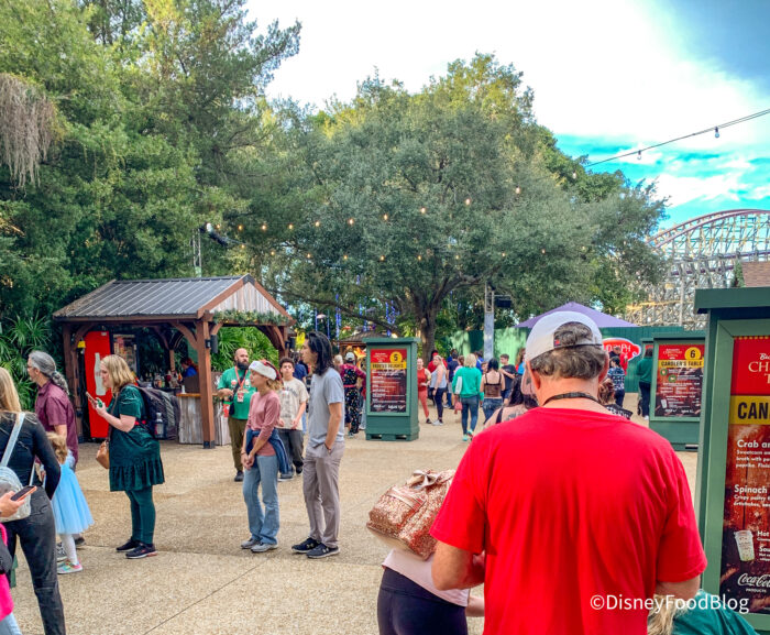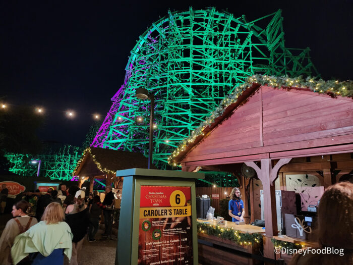 Entry to the festival is included with park admission, and it runs from park open to close — though the food booths don’t open until 4 PM. There are 19 different food booths, each with its own menu of holiday eats and plenty of drinks. Most of the food booths are located in one central area — the Festival Marketplace — but there are additional booths spread throughout the park, too.