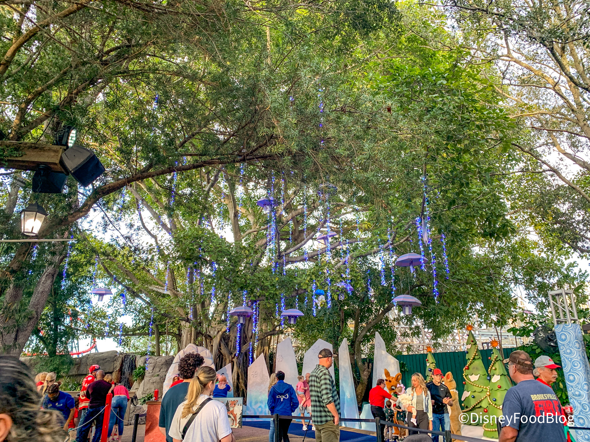 The park really does get fully decked out for the holidays, with lights in the trees…