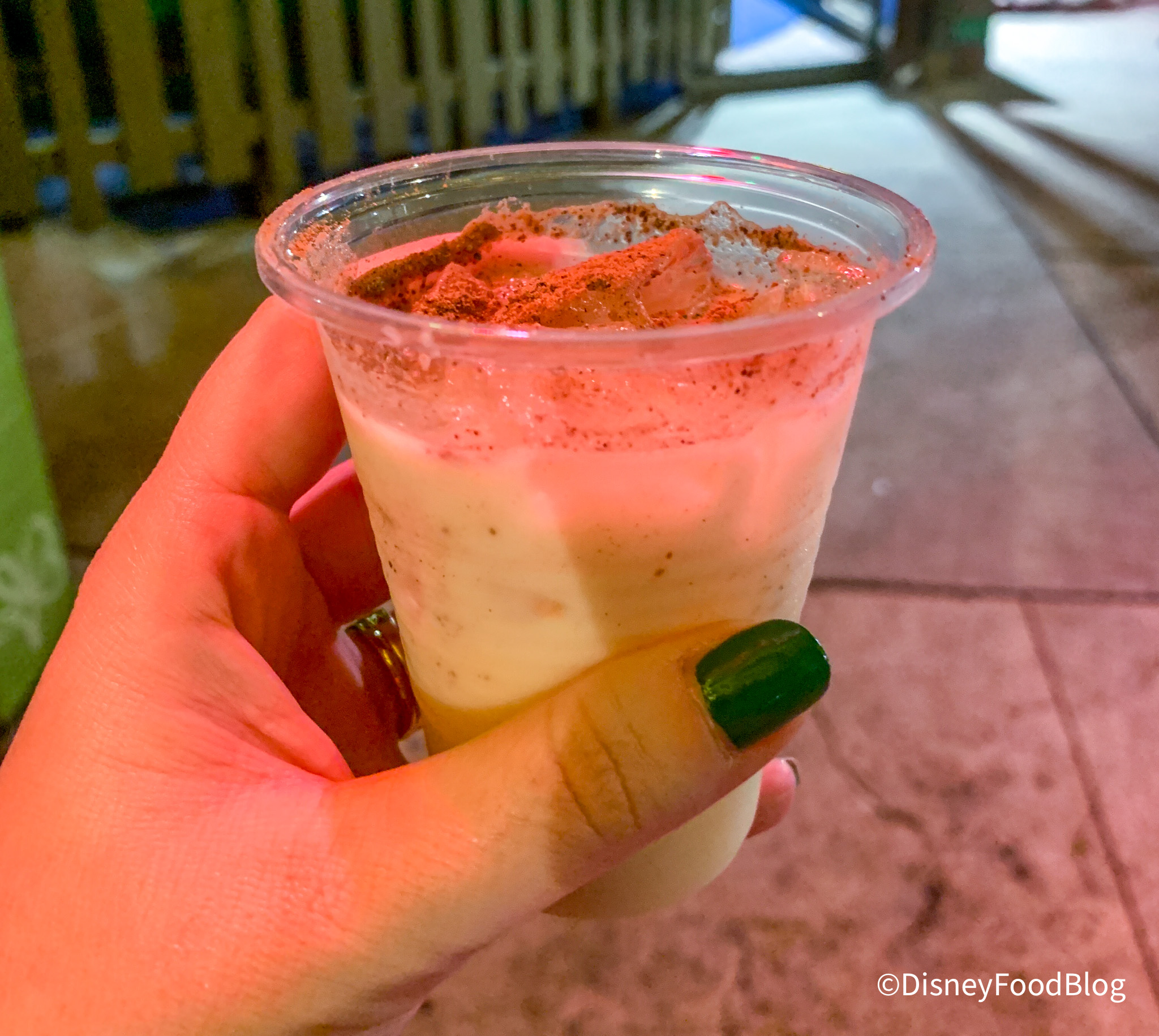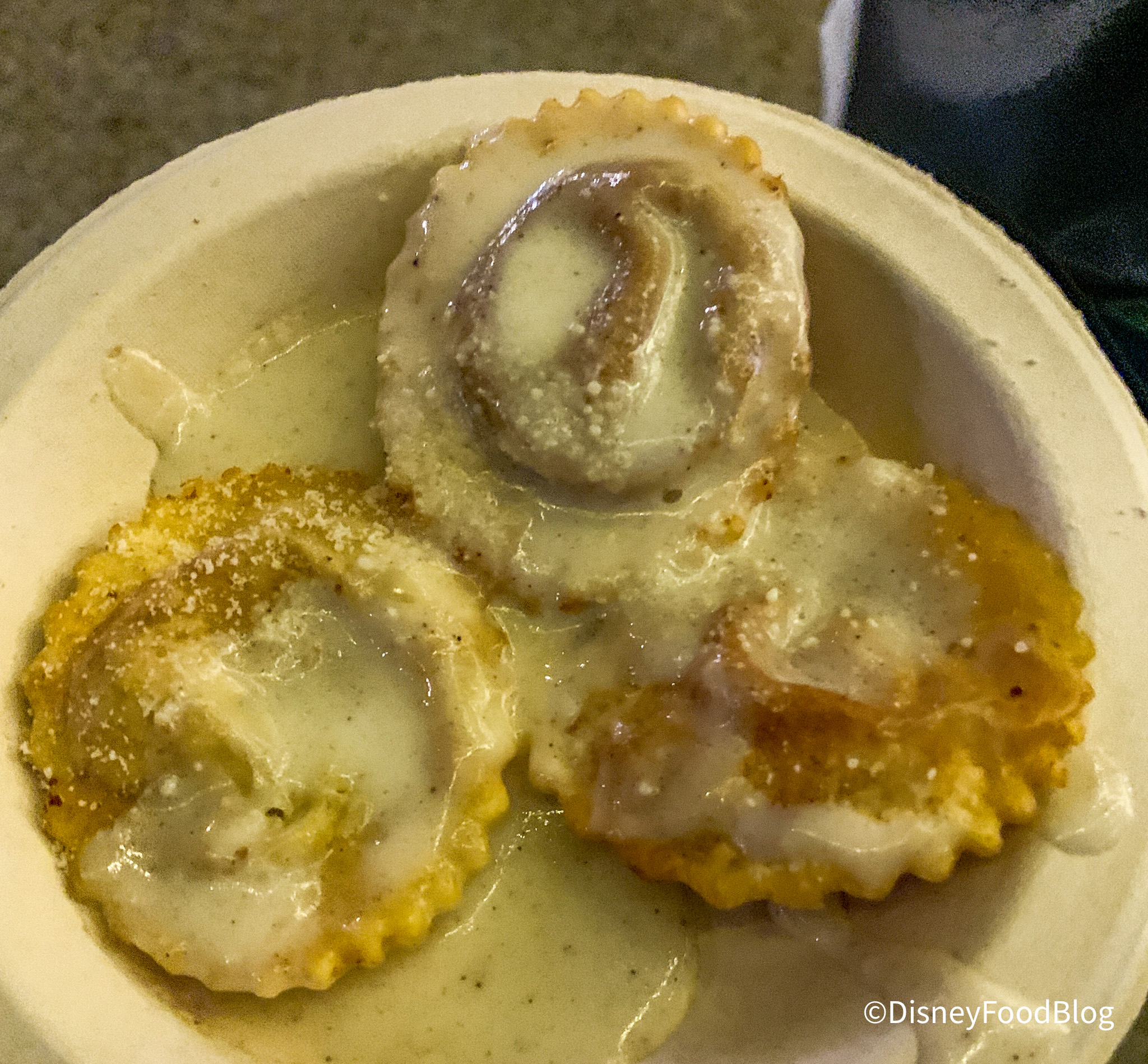 You can expect dishes like slow-roasted prime rib, toasted pumpkin ravioli, favorite desserts like apple pecan cobbler, a traditional holiday yule log, and more — but I’ll warn you that these items tend to run out quickly. I arrived at the park around 4 PM, when the booths began serving food and drinks, and I was able to grab a drink pretty quickly, but I wasn’t quite ready to eat just yet — which proved to be a big mistake. More on that later, though.