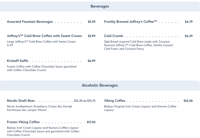 You’ll also find a handful of Norwegian alcoholic and non-alcoholic drinks. Some of them have cool names like the Frozen Viking Coffee or the Kristoff Kaffe.