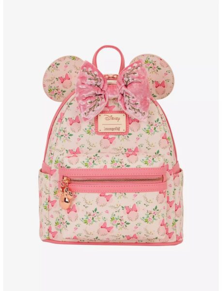 Take a look at this gorgeous Floral Minnie Mouse Loungefly Bag! It features a flower-like pattern with an all-over print of Minnie Mouse heads. This mini backpack includes a velvet bow, figural ears, and a metal Minnie zipper charm.