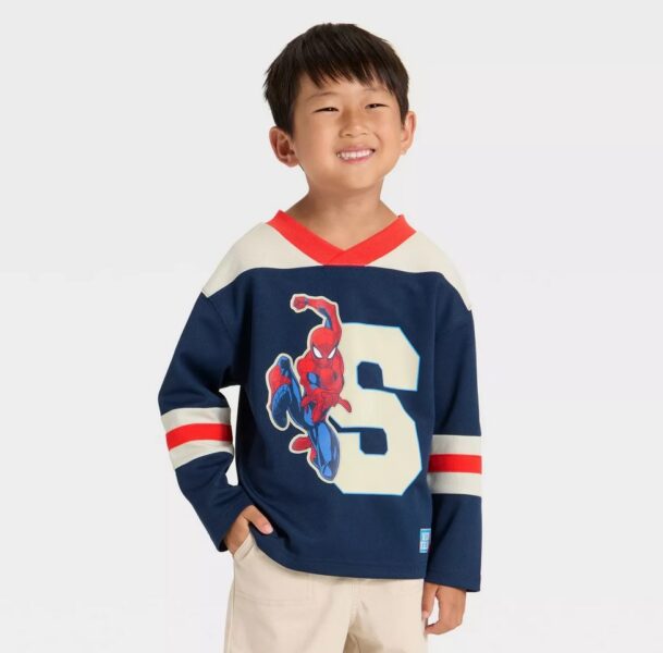 The Toddler Boys’ Marvel Spider-Man Hockey Jersey is available in 4 different sizes and comes in navy blue. The front features Spider-Man slinging a web and a big letter S, while the back has the name Parker on it as well as the number 62 — the year the Web-Head was created (1962).