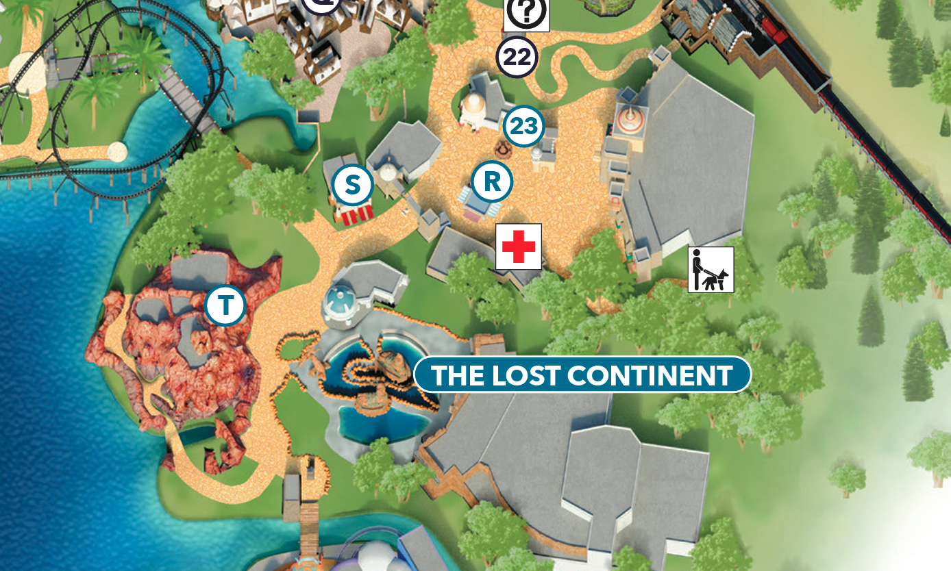 The Lost Continent currently has shops and two quick-service restaurants in operation, in addition to the table-service restaurant, Mythos. These are directly in front of the closed stunt show and across from Poseidon’s Fury. It wouldn’t be surprising if we saw some of these, the ones closest to the stunt show’s building, close when the construction walls go up.