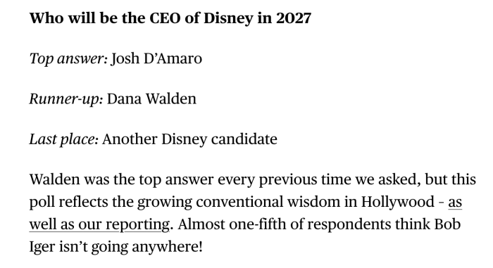 Of the 700 respondents, 212 believed Josh D’Amaro would be next, 159 thought it would be Dana Walden, and 126 thought Bob Iger would remain CEO. Additionally, 109 thought there would be Co-CEOs, 63 thought it would be an outsider, and 39 thought it would be another Disney candidate. In the previous polls done by Bloomberg, Walden was the top answer, but that has changed in this year’s poll.