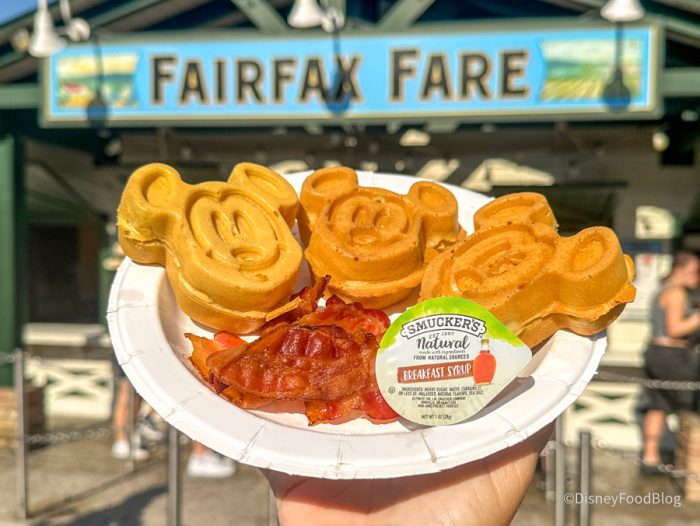 The first place you can grab the small, fluffy Mickey Waffles in the parks is at Fairfax Fare in Hollywood Studios. This quick-service restaurant offers a Mickey waffle platter for breakfast. For $9.79, you get three Mickey waffles served with syrup and bacon. It’s like the ultimate Disney-themed breakfast, and it’s only one of two places you can get these waffles. We don’t know if this was some kind of in-the-parks Mickey waffle experiment that failed, and now we don’t get Mickey waffles anywhere else, or what the reason is for them being here and almost NOWHERE else, but it’s pretty disappointing.