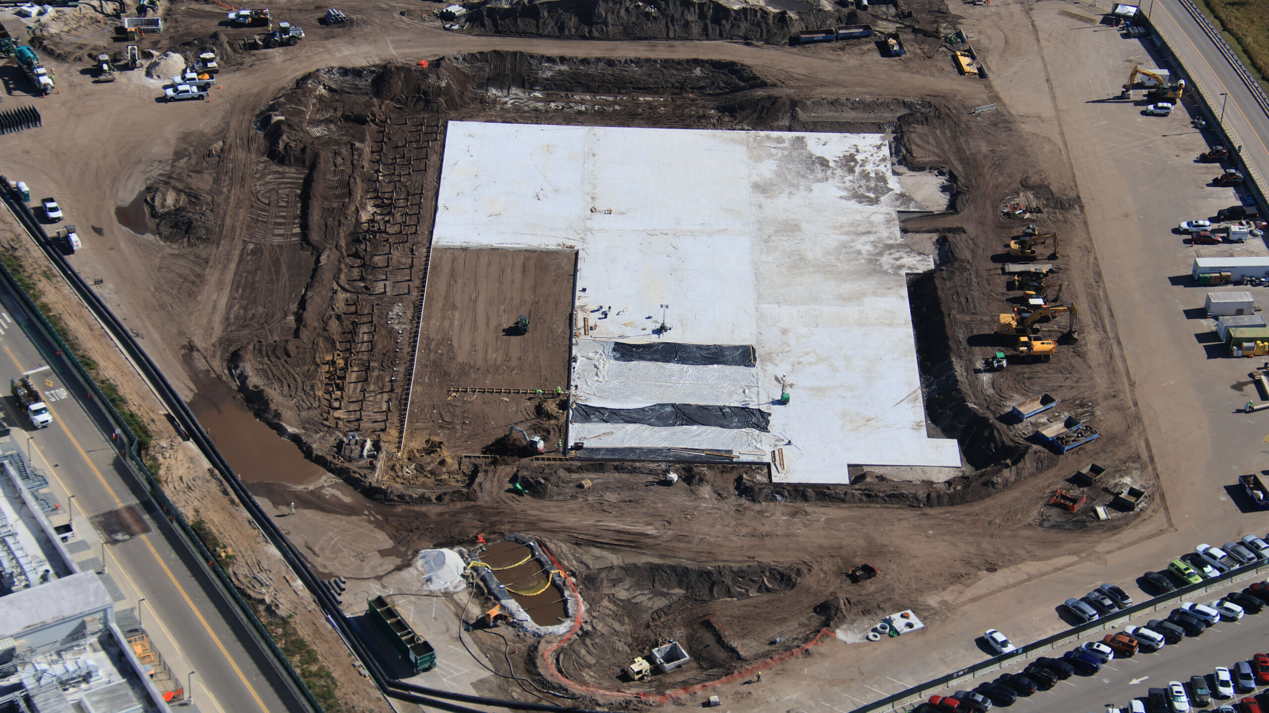 After the concrete floor was poured, it was covered with protective plastic. You can also see workers preparing concrete forms for the next section of the floor for the ride.