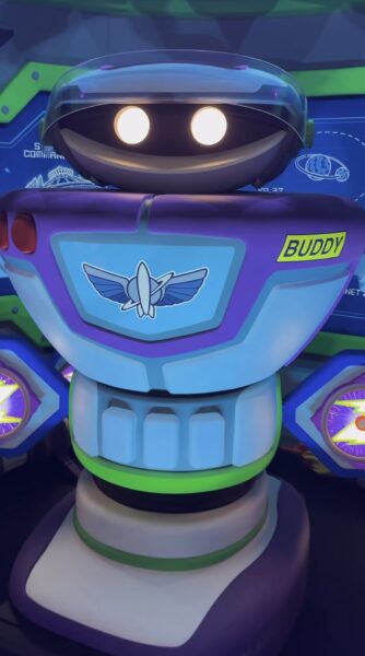 While Disney has previously introduced us to Buddy and we have seen concept art of the new character, now we are getting to see her for the first time inside of Buzz Lightyear’s Space Ranger Spin! Mike from Walt Disney Imagineering introduces us to Buddy and shares a bit about her.
