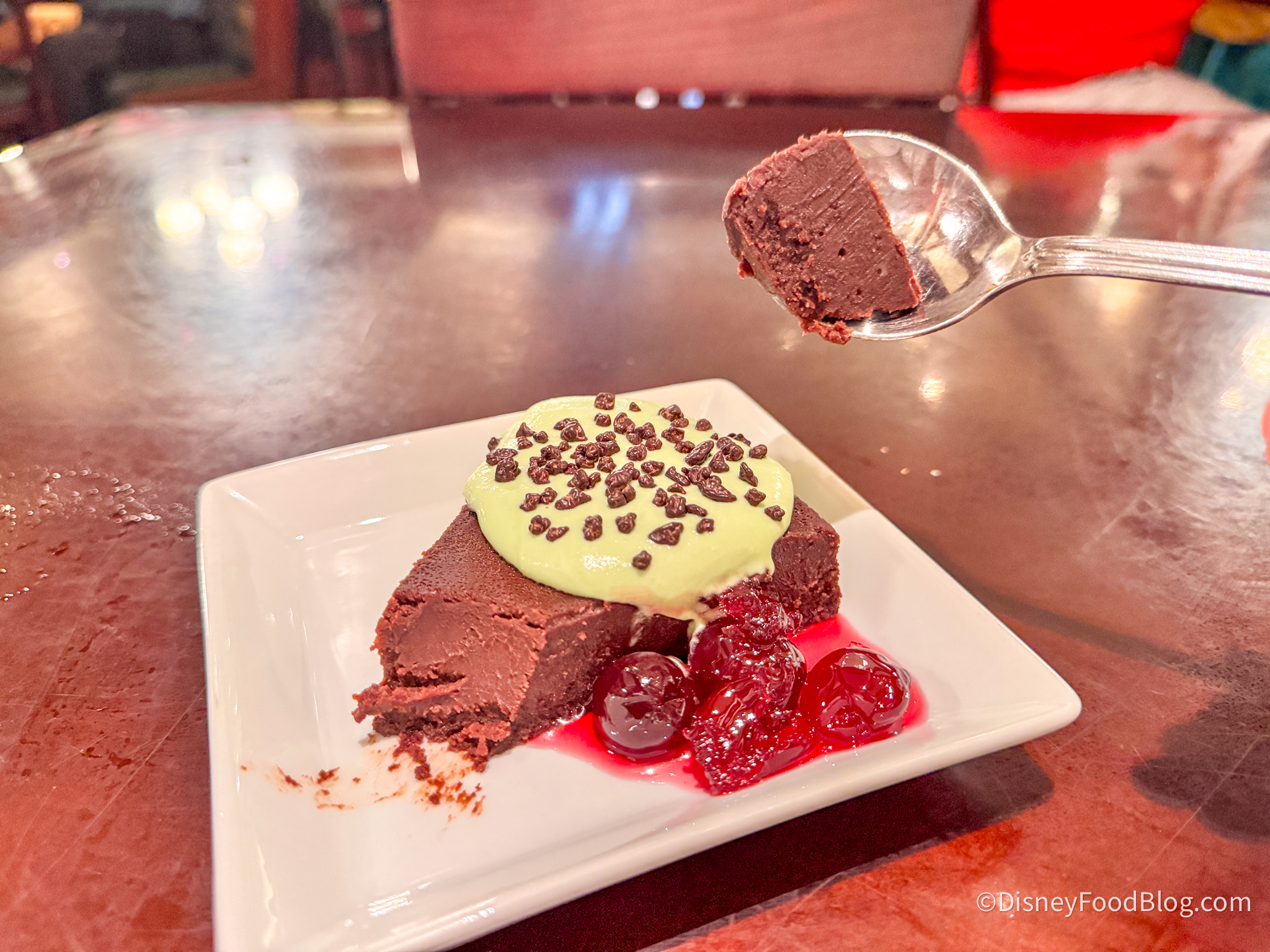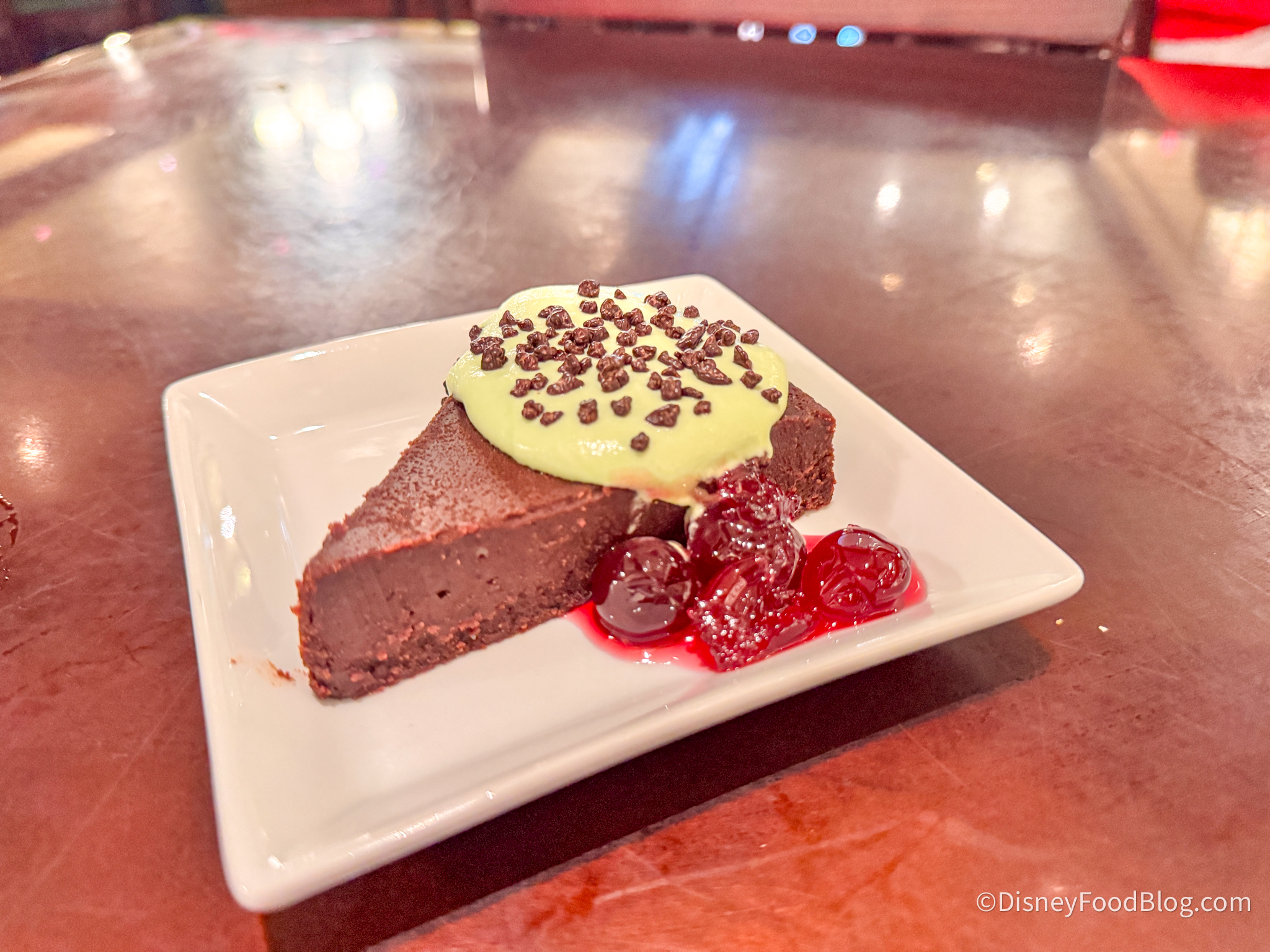 Then, to wrap it all up with something sweet, I chose the Flourless Chocolate Cake for $9. It’s served with Pistachio Cream, Cherries, and Cocoa Nibs.