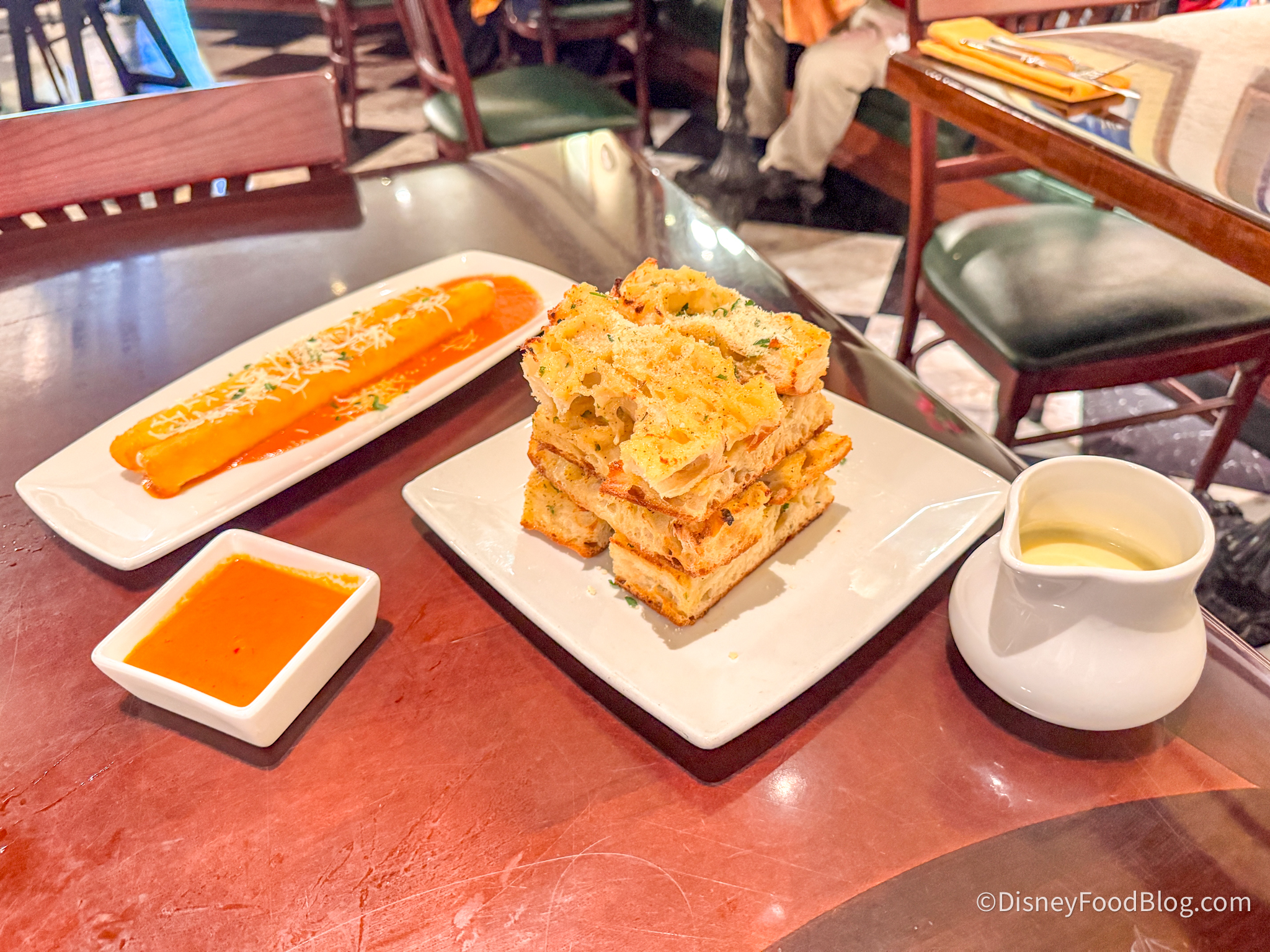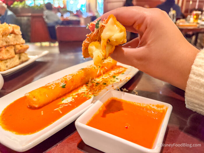 Well, after hearing over the past couple of years that Tony’s had changed and that it was no longer a horror show, we decided to give it a(nother) try after years of ignoring it during our last trip to WDW. As I recall, the service was very attentive. We were seated in the patio area, which felt very open and pleasant, as it was still during daylight hours. We did wind up ordering the foot long mozzarella stick which was fine, but more memorable because it was a foot long rather than because it was the best one we’d ever had (it wasn’t). But the tomato sauce served with it was “orangy” in color, exactly like the sauce in the photos in this review. It tasted (& looked) closer to Ragu than a well made pasta sauce that a chef had labored over in the kitchen. It was edible, but it wasn’t very good. I recall there was all this hoopla that Tony’s had hired a new chef & had replaced many of the old dishes & menu items and that this new chef was coming in to shake up things and bring in new & better dishes & recipes, etc.,