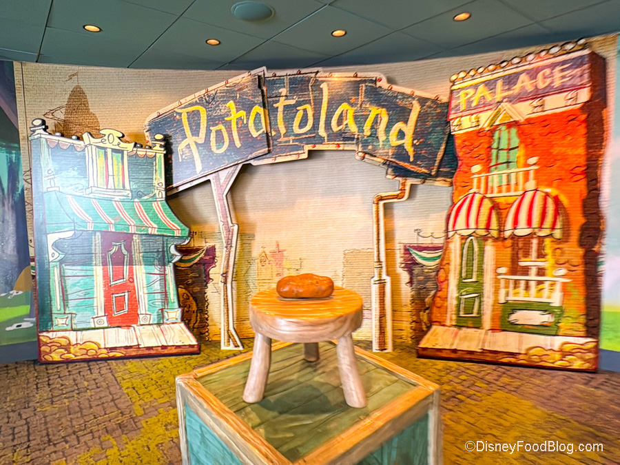 The first thing we noticed when we stepped into the theater was that the Potatoland photo op is back. It’s been missing for a hot minute, and the last time we saw it, the space was being used for merchandise during Jollywood Nights. But it’s BACK, baby! Potatoland is a fake theme park Mickey and Minnie built for Goofy because he said he wanted to go there…but it didn’t exist. We wished we had the kind of friends that would build us a theme park!