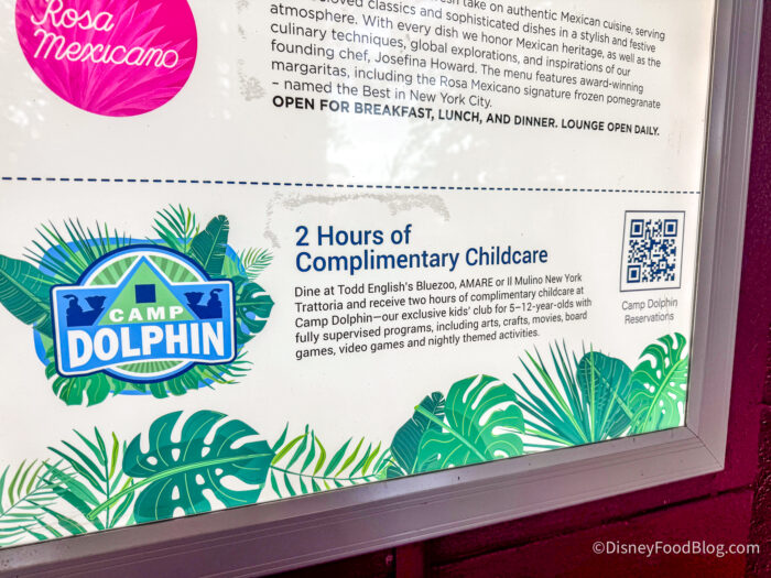 While we were waiting at a bus stop near the Walt Disney World Swan Hotel, we saw a sign that advertised this amazing deal. If you dine at Todd English’s bluezoo, AMARE, or Il Mulino New York Trattoria, you’ll receive two complimentary hours of childcare for your kids at Camp Dolphin!