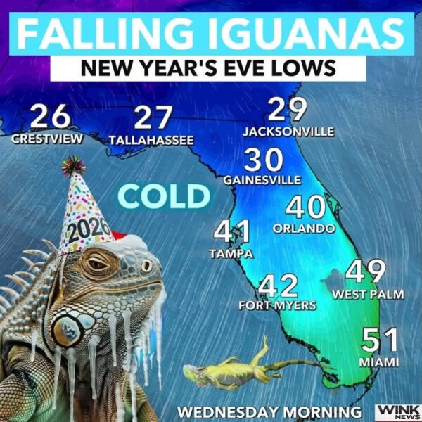 WINK News Chief Meteorologist Matt Devitt has warned Floridians on his Instagram that this New Year’s Eve, it’ll be so cold in and around Orlando that it’s possible iguanas could fall from their perches in trees! However, don’t panic — these iguanas aren’t dead, they’re just temporarily stunned and immobilized from the chill.