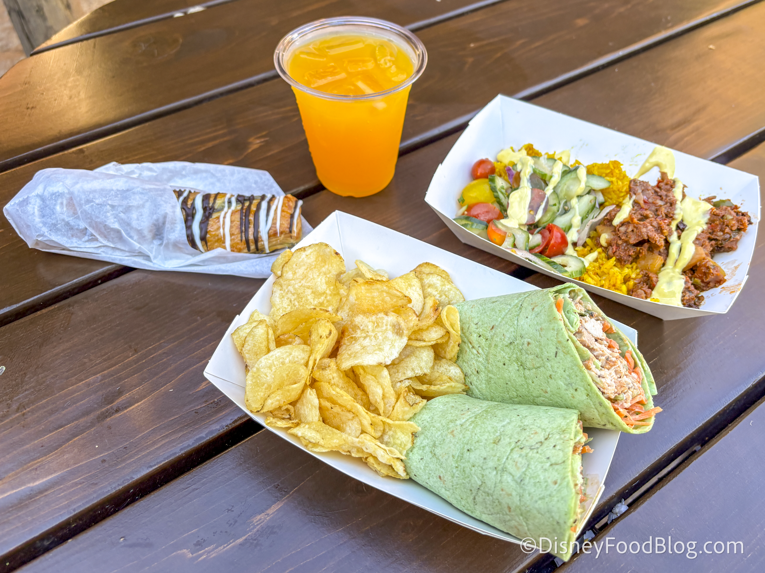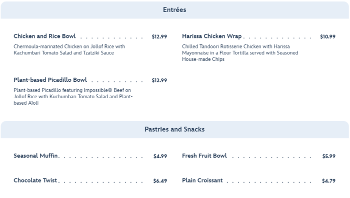 Like we said before, Kusafiri has a pretty limited menu. During lunch and dinner, you can find a Chicken and Rice Bowl, a Harissa Chicken Wrap, and a Plant-Based Picadillo Bowl. There are also some pastries and snacks available, including a Chocolate Twist.