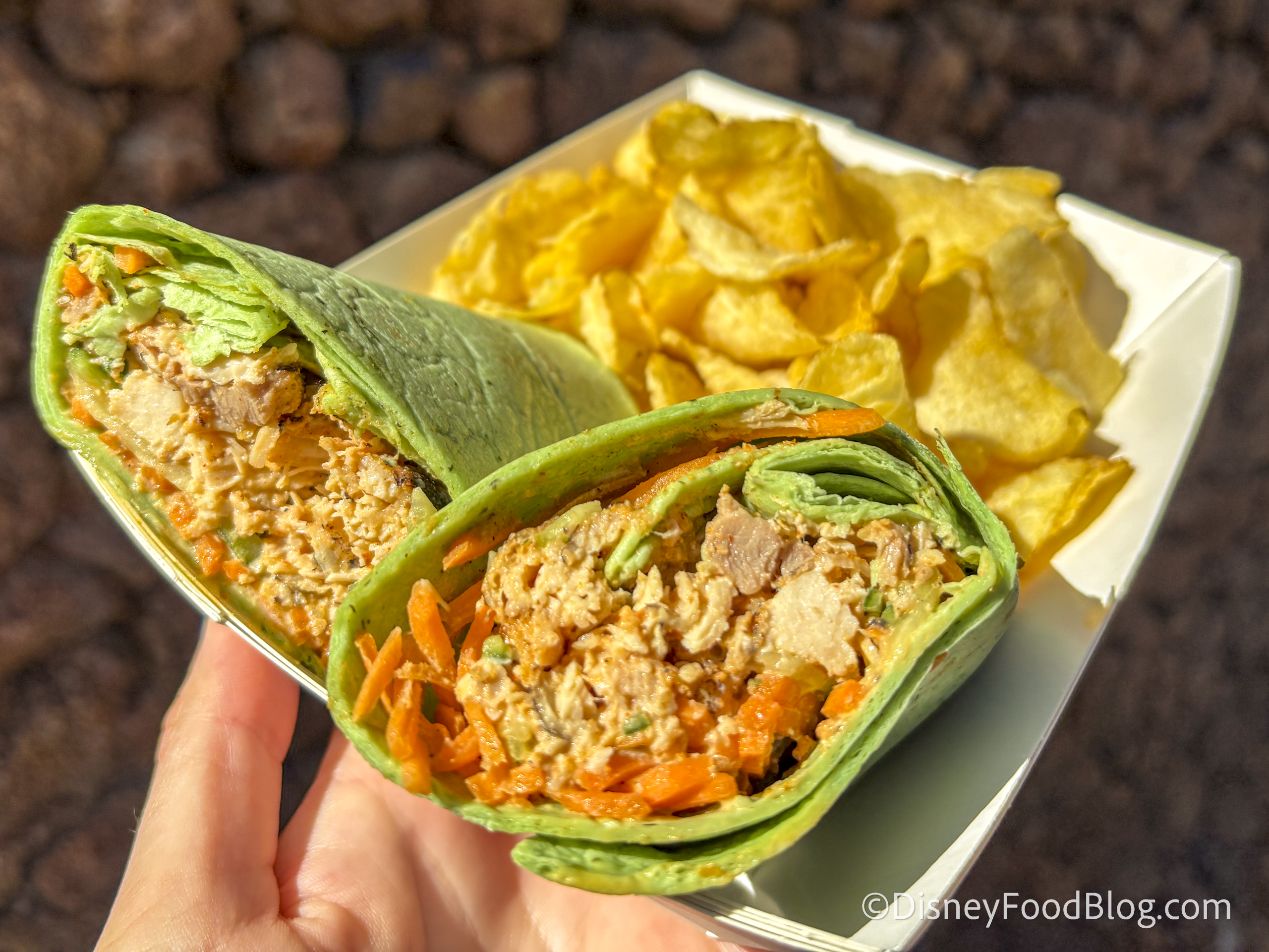 The wrap is served with plain kettle chips — not the house-made, seasoned chips described. They were tasty enough, but we would have preferred seasoned chips! They taste just like the Cape Cod kettle chips.