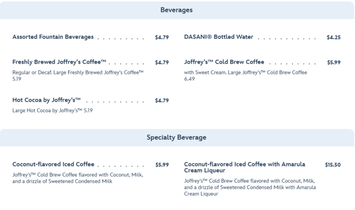 There are also a few drink options, including Coconut-flavored Iced Coffee available in alcoholic and non-alcoholic versions.