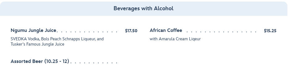 You can also choose from other alcoholic beverages, such as Ngumu Jungle Juice, African Coffee, or Assorted Beer.