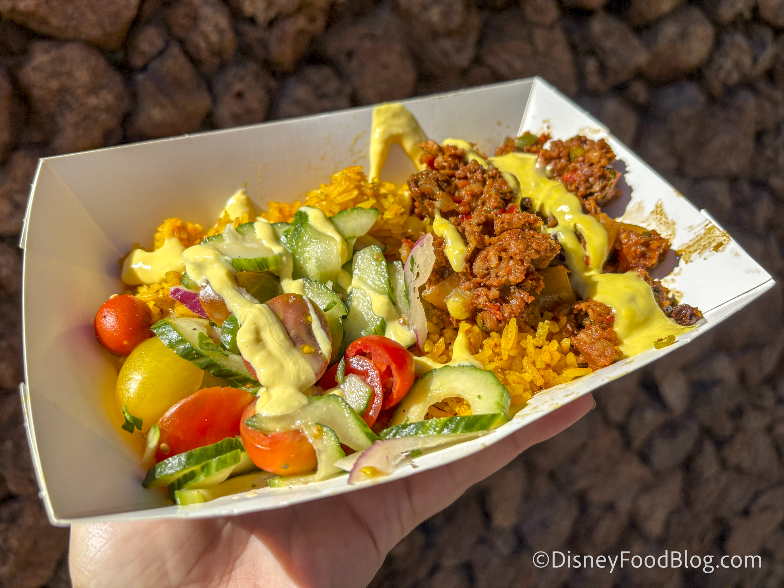 Honestly, the meat could have fooled us into thinking it was real. It had a great “meaty” flavor. The only giveaway that it wasn’t real was that it didn’t have as much chew as a real meat would. The bowl also featured rice with a great tomato, cumin, and onion flavor. The rice was a bit undercooked, but it was still tasty.