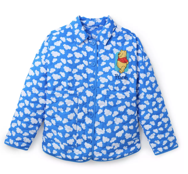 Need a warm, cozy, but also adorable jacket for winter? Look no further than the Winnie the Pooh Cloud Quilted Jacket! The whole jacket is blue with a white cloud pattern, and you’ll find Pooh on the front right breast pocket, as well as on the back with his pot of honey.