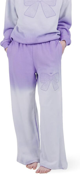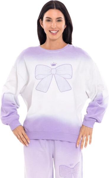 Let’s begin with the top, which features a purple ombre color scheme, a princess bow decoration, a rib knit crew neck collar, ribbed sleeve cuffs, and an elastic waistband for a better fit.
