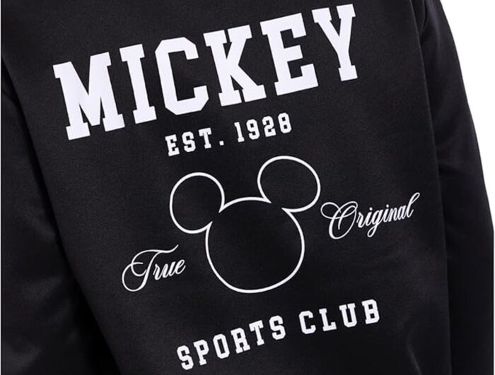 This deviously delightful track jacket features ribbed sleeve cuffs and waist, soft hand screen print design, functional pockets, cozy mock neck style, contrast side stripe with 3D satin ribbon bows, and front and back graphics with some of the company’s most iconic villains in silhouette.