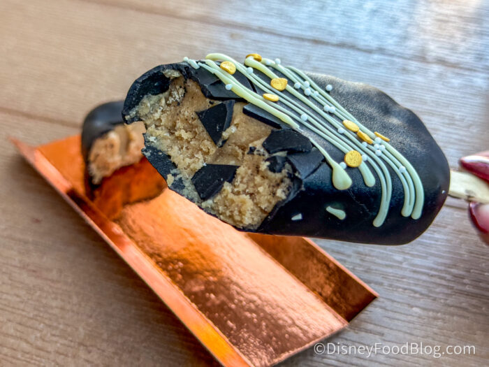 Before we get too far, let us say YUM! This thing is so dang good! Our reporter called it a Mickey ice cream bar without the ice cream. The chocolate tasted similar but a bit darker, where it was teetering on the dark chocolate side, but still had the rich, milk chocolate taste. The actual cake was like a cake mix before it fully firms, where it’s almost mushy but still easy to bite into. It held up well in the sun and heat (yes, it’s still warm in December in Orlando), and we seriously could not get enough. Everyone else felt the same because they were almost sold out, so if you’re going to grab this, go closer to when Amorette’s opens. It will be available until January 1st.
