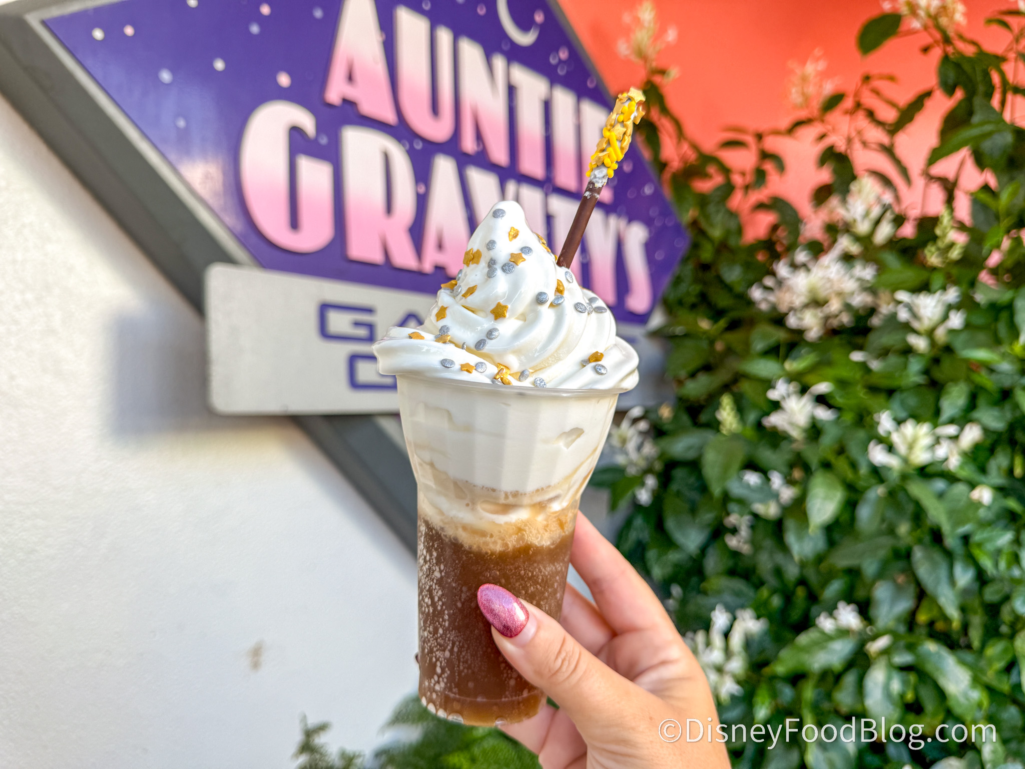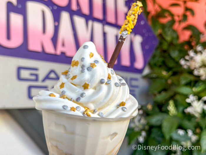 First up, we have the Happy “Root Beer” Float for $7.59 at Auntie Gravity’s Galactic Goodies in Magic Kingdom. This is root beer with vanilla soft serve, chocolate cookie biscuit “sparkler,” and shimmery sprinkles.