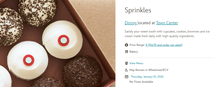 Reportedly, Sprinkles Cupcakes is heading for closure around the country, including the Disney Springs shop. Rumors have been circulating online that the national chain will be closing permanently on January 1st, 2026, although the company has not made a comment. The popular dessert shop, which is known especially for its cupcake ATM, is no longer showing hours on the Disney website as of January 1st, 2026. The Walt Disney World app also says it’s closed.