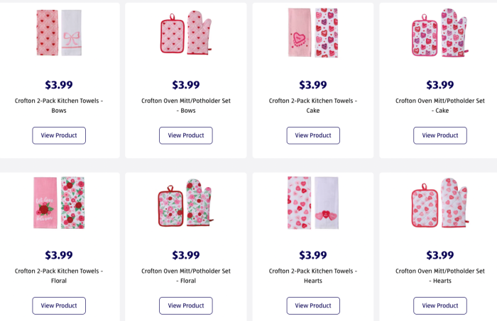 Don’t forget about these pink and red Valentine’s kitchen essentials. You can find oven mitts, potholders, and towels — covered in hearts, bows, and flowers.