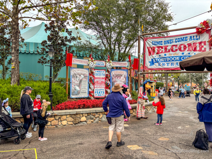 Right at the entrance to Storybook Circus, we quickly spotted Minnie and Goofy, both still dressed in their iconic attire from Pete’s Silly Sideshow. There was a tape queue set up for people to follow, which appeared to be working relatively well.